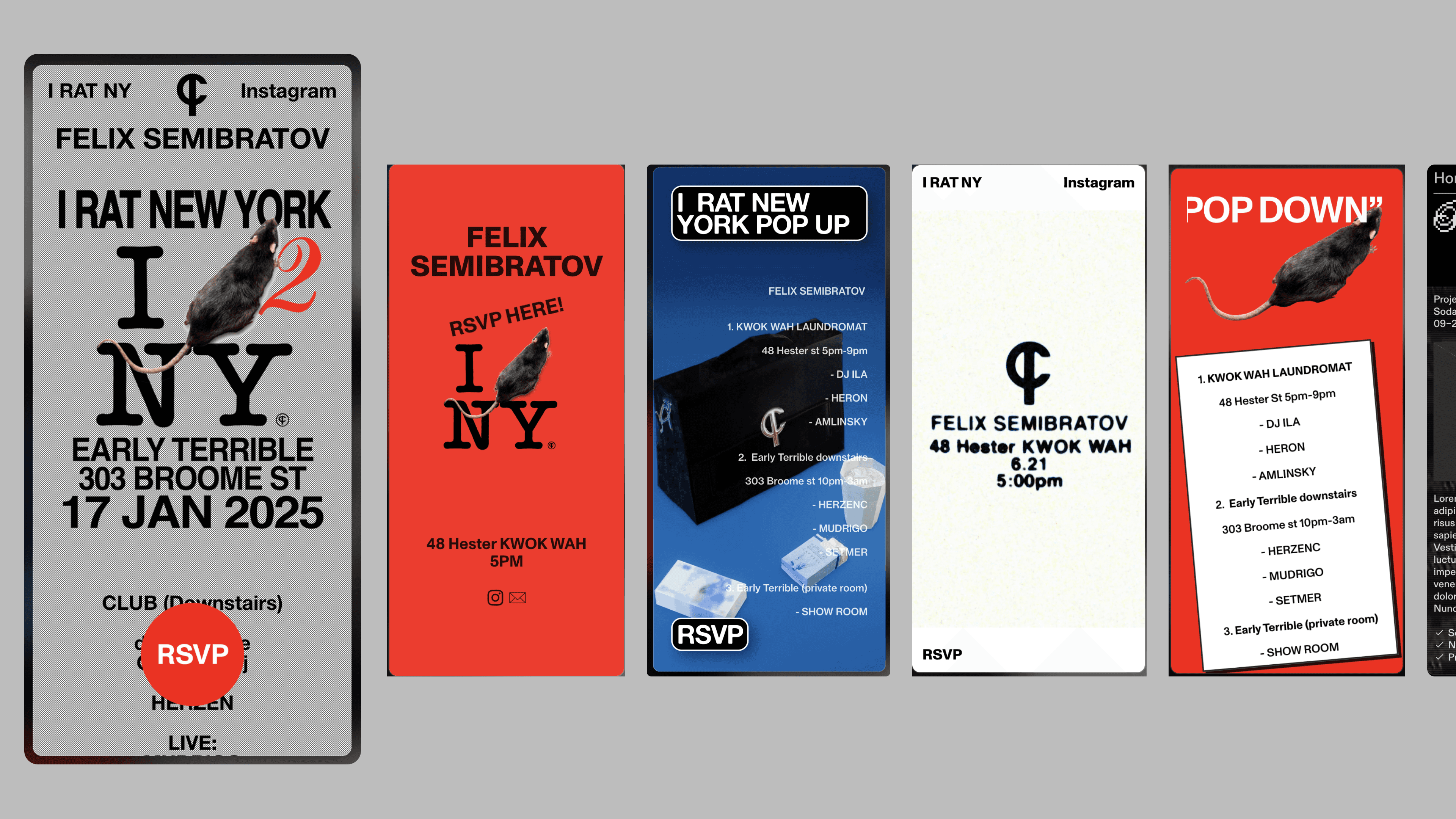 During the summer of 2024, I worked as a freelance designer for Felix Semibratov, a New York-based fashion brand, supporting the launch of a new venue at Early Terrible in the Lower East Side. The project combined digital design, motion media, and physical installation to create a cohesive promotional experience for the opening event.