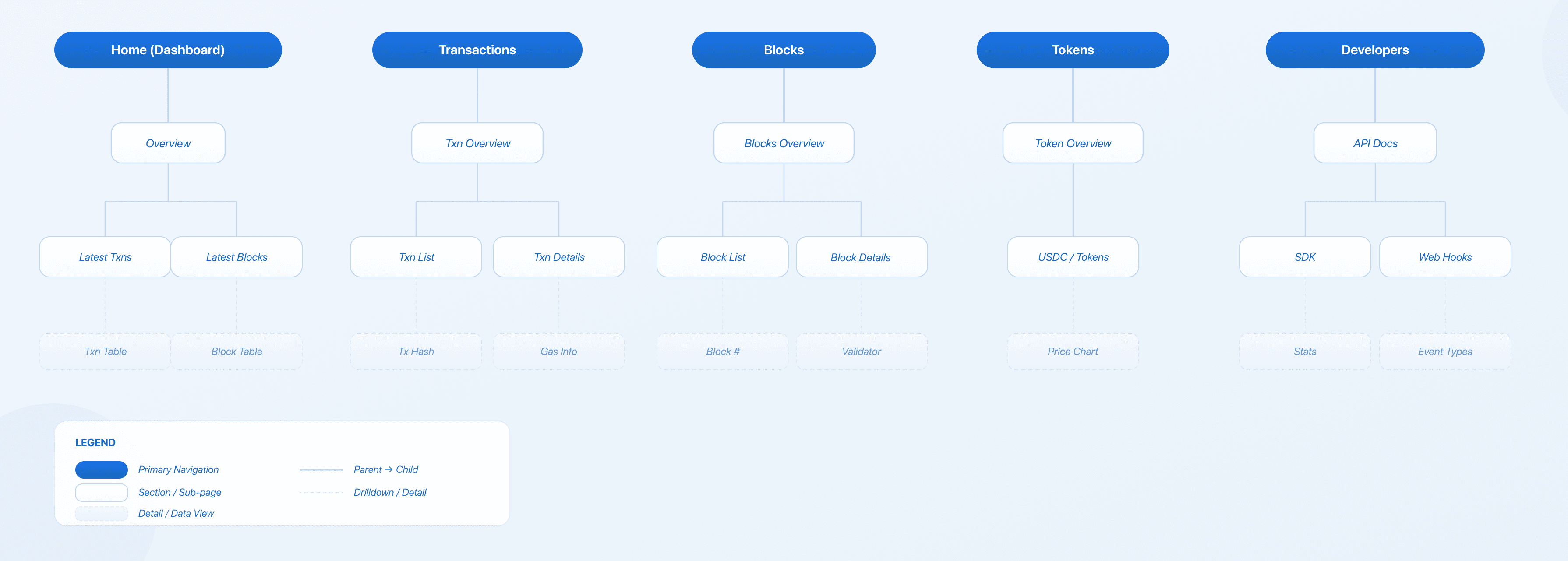 This structure separates high-level network visibility from detailed data views, allowing users to progressively drill down from summaries to specific transaction, block, or token information while maintaining clear navigation across the platform.
