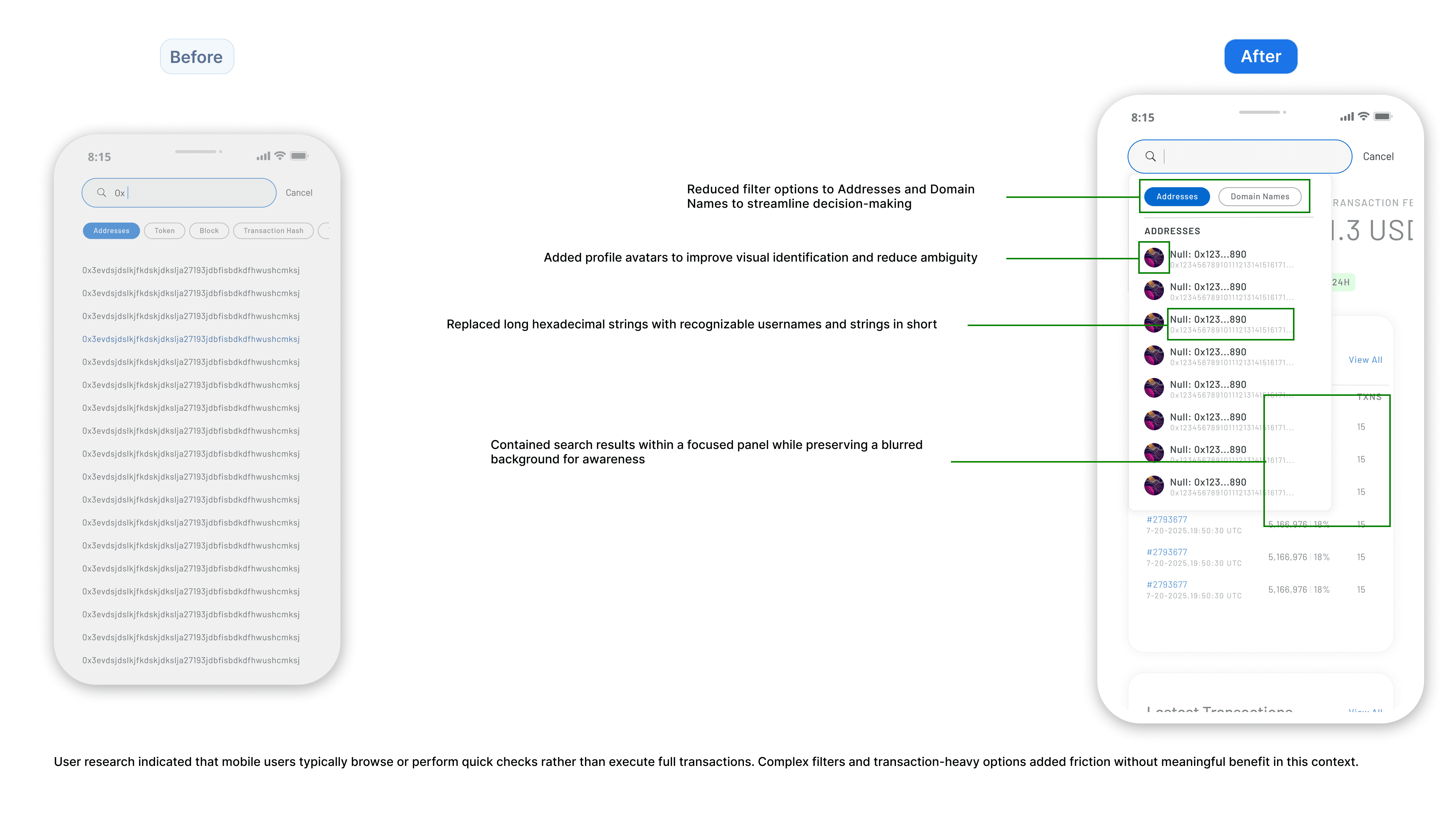 The core challenge was not reducing information, but making complex blockchain data legible at a glance.