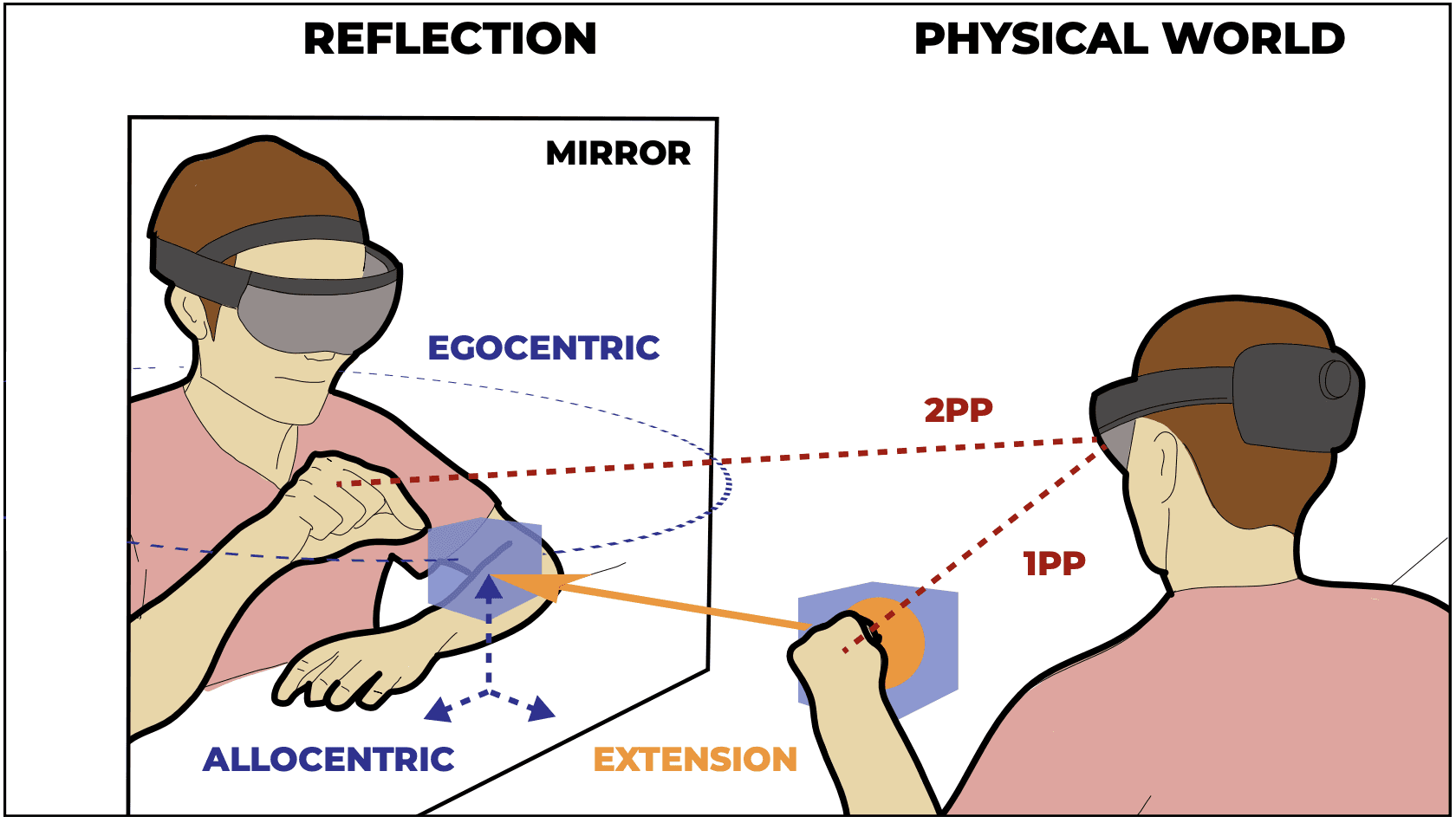 The right hand controls the paddle in physical space — standard direct manipulation. The left hand controls a paddle inside the mirror. To intercept the ball on the reflected side, the player has to focus on their reflection rather than their actual hand, essentially operating a remote avatar of themselves.