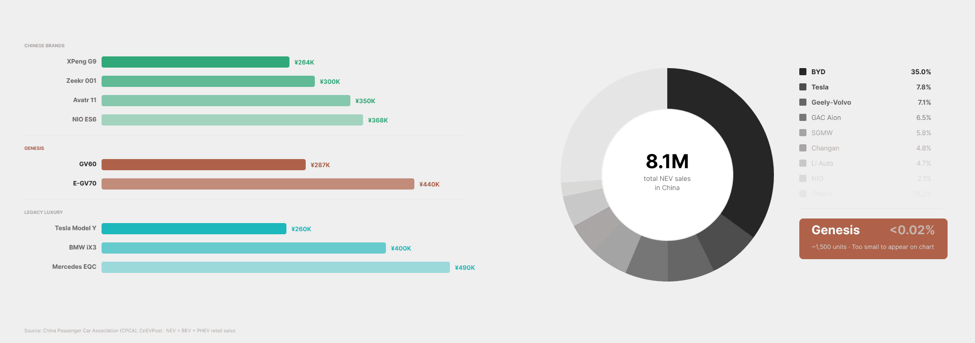Genesis enters the Chinese EV market with extremely limited brand recognition compared to dominant domestic players such as BYD, NIO, and XPeng.