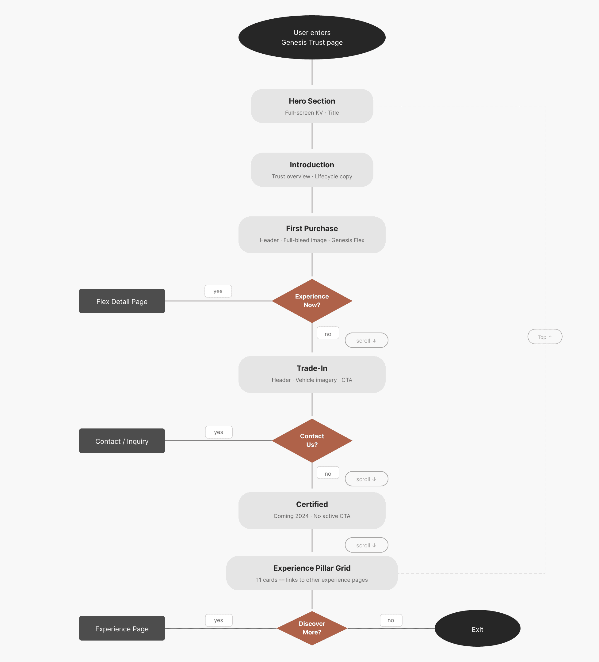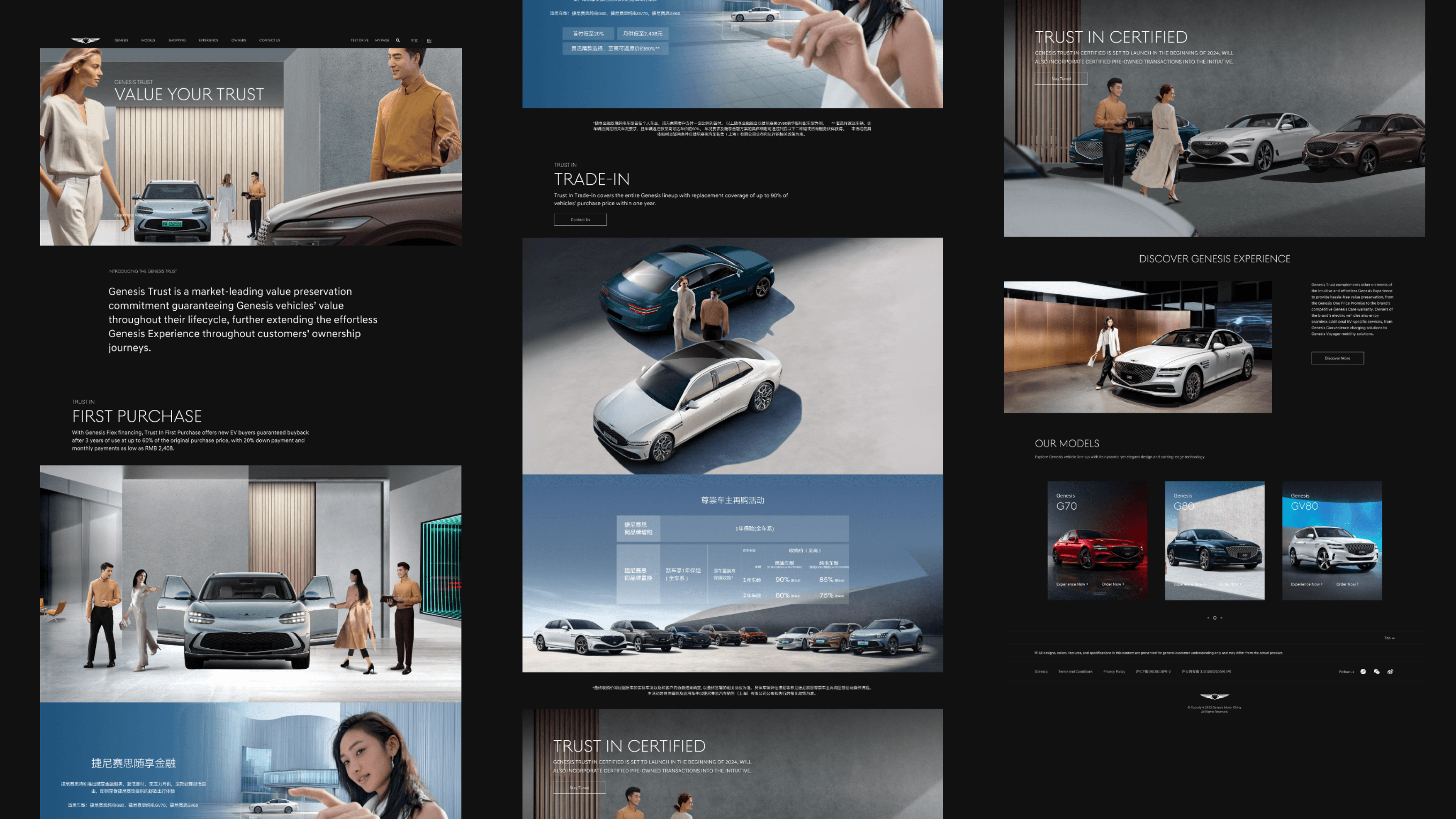 The Trust page was structured as a guided narrative experience, combining cinematic brand storytelling with progressive product discovery. High-impact visual sections introduce Genesis’s design philosophy and craftsmanship, while strategically placed decision points allow users to transition from passive exploration into deeper engagement.